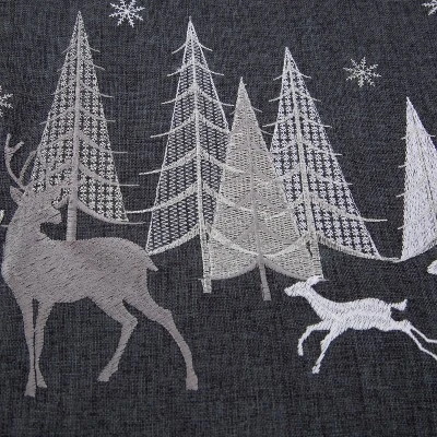 - Single-sided: Design includes an embroidered winter scene in a mix of metallic yarns on a dark gray ground