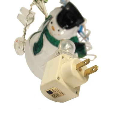 Cute Frosted Snowman Night-Light Wearing A Green Glittered Scarf And A Black Top Hat With A Glittered Silver Band. In His Wire Hand He Holds A Wire Banner With The Message “Let It Snow”. The Letters Flash In Colors Of Red, Blue And Green.. New. Comes Packaged In A Box.. Measurements 8.25 In H X 3.25 In W X 3.0 In D. . No Assembly Required. Imported